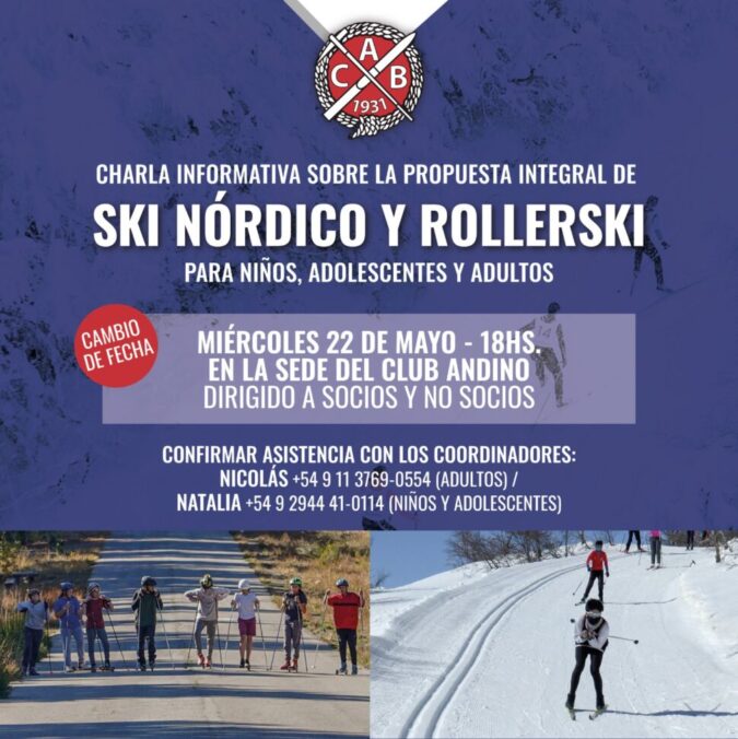 NUEVA FECHA Charla informativa abierta al público, para socios y no socios del Club, sobre la propuesta integral de ski nórdico y rollski 2024. Para niños, adolescentes y adultos. Lugar: Sede CAB Día: Miércoles 22 de mayo Horario: 18 horas Confirmar asistencia con los coordinadores: Nicolás +54 9 11 3769-0554 (Adultos) / Natalia +54 9…