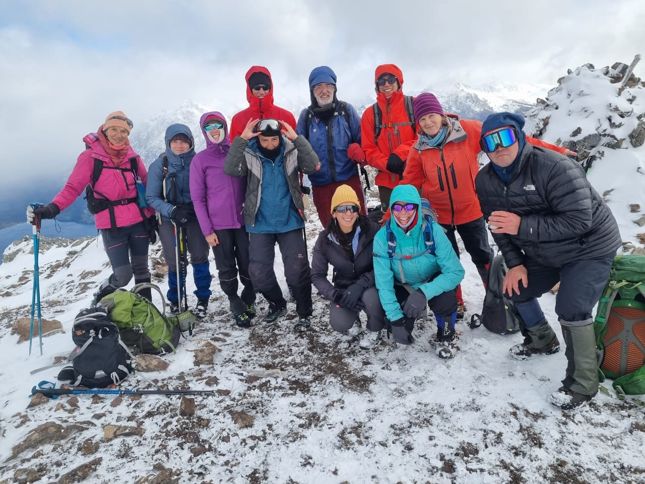 Después de recorrer esa hermosa media luna que arranca en la Ventana hacia el este, pasa por el collado de avalancha al sur y termina en la cumbre al oeste, llegamos arriba. Sin prisa ni pausa, paso a paso, rotando quien iba al frente para practicar la navegación. Muy unidos y contentos. Estábamos a un poco más de 1900 metros. Si bien hacía frío, todos estábamos bien abrigados. Disfrutamos muchísimo de esa vista cumbrera extraordinaria, entre la estepa y la cordillera. Almorzamos unos sándwiches, algo dulce también, compartido a la canasta.