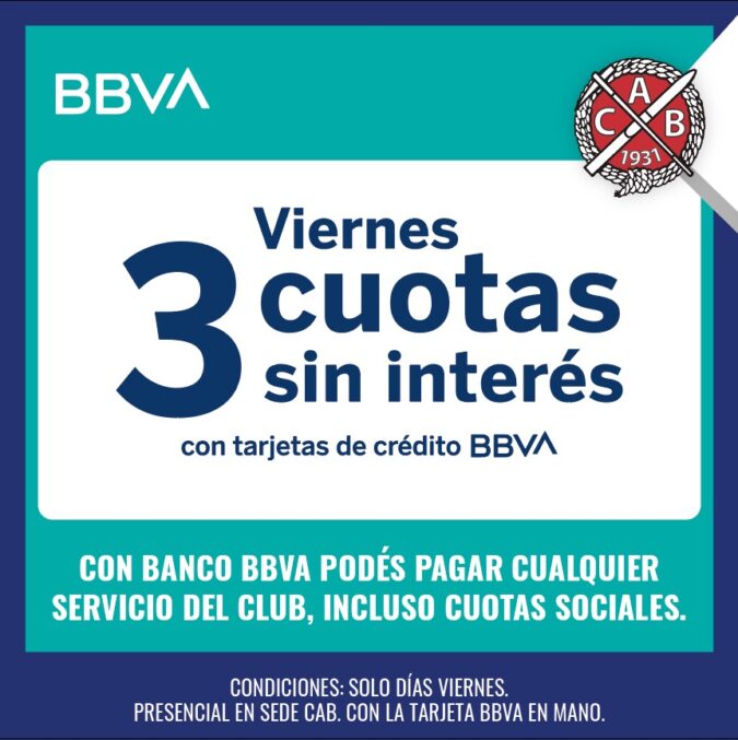Nos complacemos en contarles que todos los viernes, los servicios de nuestro club se podrán abonar con tarjetas de crédito de BBVA en 3 cuotas sin interés. La modalidad será presencial, asistiendo el titular portando su tarjeta en nuestra sede ubicada en 20 de Febrero 30.