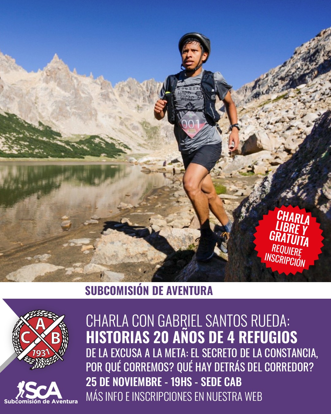La Subcomisión de Aventura del Club Andino Bariloche invita a participar de la charla abierta “Historias 20 años de 4 Refugios: De la excusa a la meta: el secreto de la constancia, por qué corremos, qué hay detrás de un corredor?”, a cargo de Gabriel «Saga» Rueda.