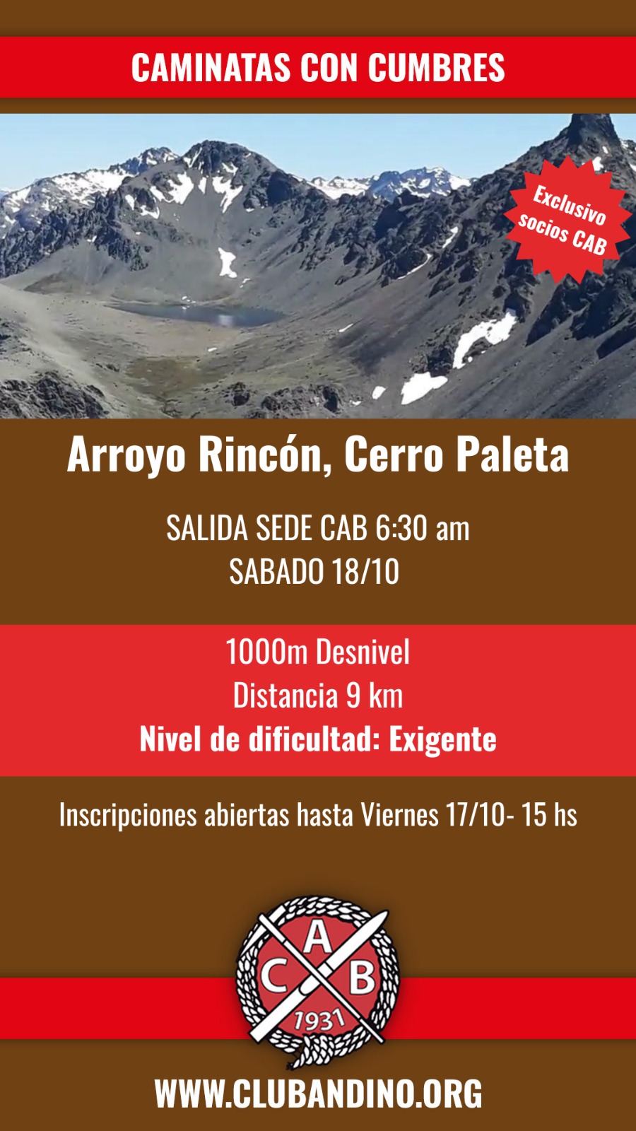 El grupo del Club Andino Bariloche, Caminatas con Cumbres vuelve a tener propuesta para sus socios, una actividad que combina actividad física, contacto con la naturaleza y la experiencia de alcanzar nuevas alturas en la cordillera. En esta oportunidad, la salida será al Arroyo Rincón y Cerro Paleta, el próximo sábado 18 de octubre, con partida desde la sede del CAB a las 6:30 de la mañana.