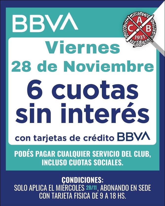 La promoción solo será válida abonando en la sede del club, con la tarjeta física BBVA, en el horario de 9 a 18 horas. Destacamos esta iniciativa que busca facilitar a los socios en cumplimiento en sus compromisos y mantener el cumplimiento de sus compromisos y mantener el acceso a las actividades y servicios que ofrece el Club durante todo el año.