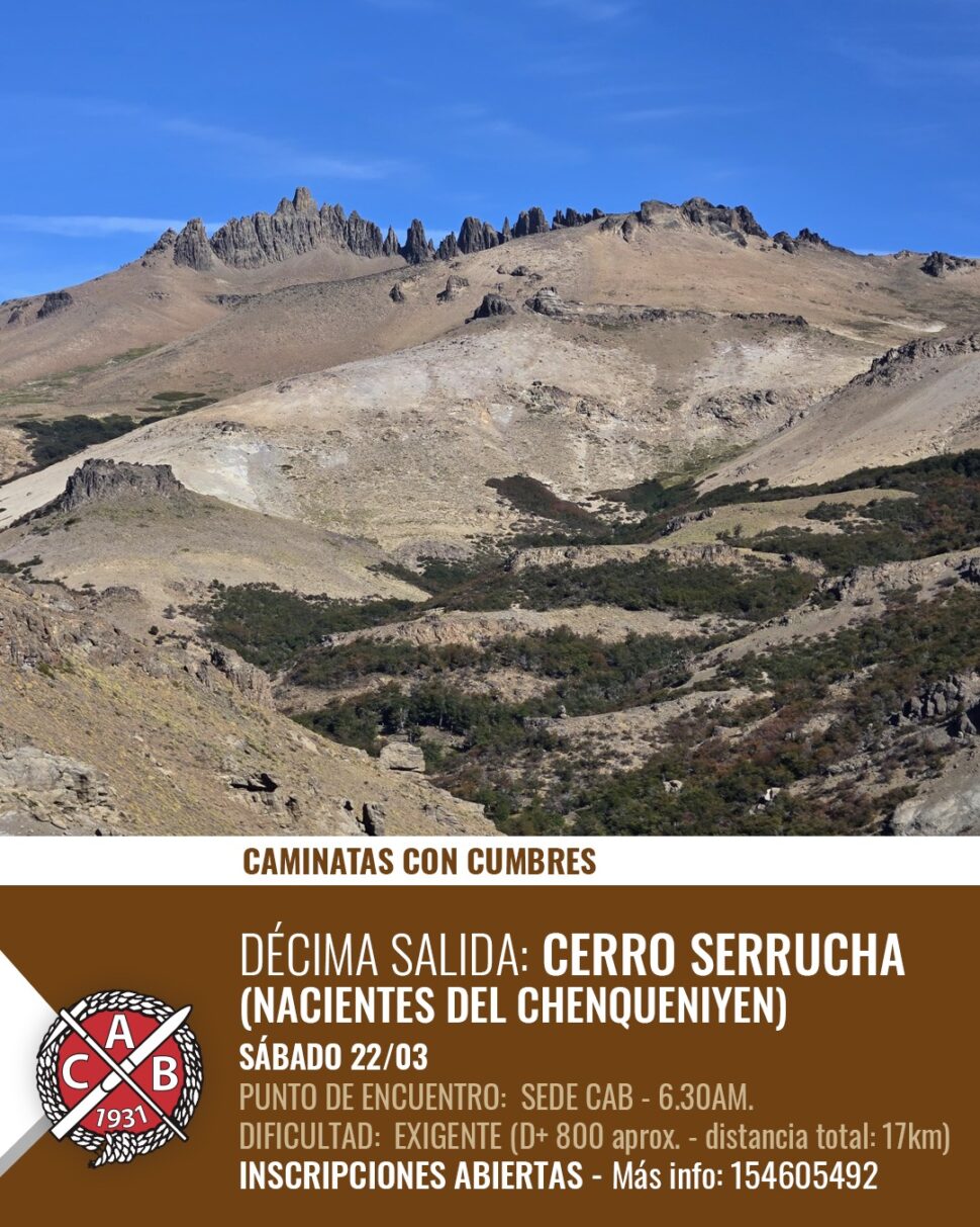 El grupo Caminatas con Cumbres llevará a cabo su décima salida el próximo sábado 22 de marzo, con destino al Cerro Serrucha, ubicado en las nacientes del Chenqueniyen. La actividad está dirigida a quienes buscan una experiencia de senderismo exigente, ya que presenta un desnivel positivo de 800 metros y una distancia total de 17 kilómetros.