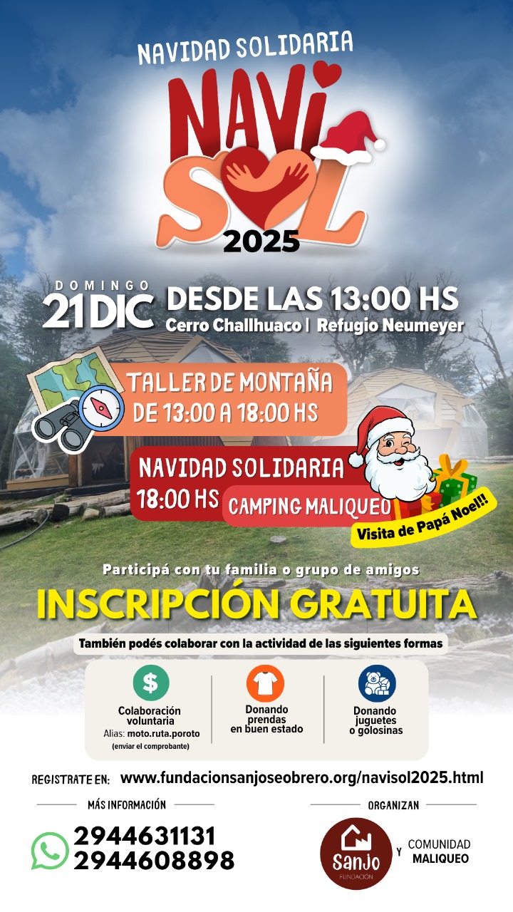 A las 18:00, el Camping Maliqueo reunirá a los participantes para un “Tercer Tiempo” solidario, donde se compartirán viandas e historias, y donde Papá Noel entregará regalos y golosinas a los niños gracias a las donaciones de la comunidad. Las inscripciones son gratuitas para grupos o familias de al menos dos personas (una mayor de 18 años) y deben completarse en https://fundacionsanjoseobrero.org/navisol2025.html